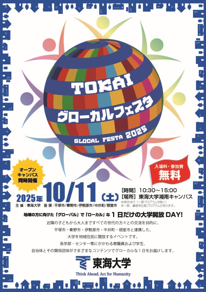 【10月11日】湘南でグローカルフェスタ 2025/10/01湘南キャンパスを地域住民に開放するイベント「TOKAIグローカルフェスタ2025」が、10月11日の午前10時30分から午後3時まで開催される。8回目となる今回は、70以上の企画が用意されている。...