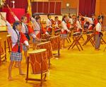 (写真下)式典中には6年生が和太鼓演奏を披露。日ごろの練習の成果を発揮した