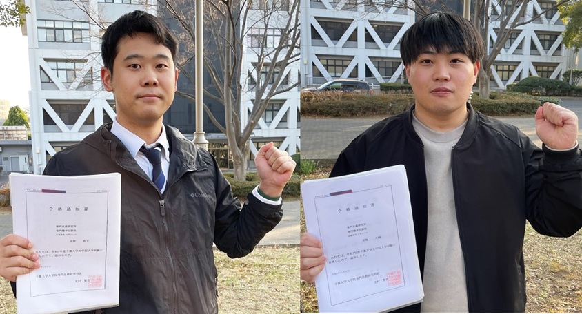法学部4年生の若梅大輔さんと浅野柊平さんがこのほど、千葉大学大学院専門法務研究科(法科大学院)に合格。法学既修者が対象の2年コースに入学し、司法試験の受験資格取得を目指す。