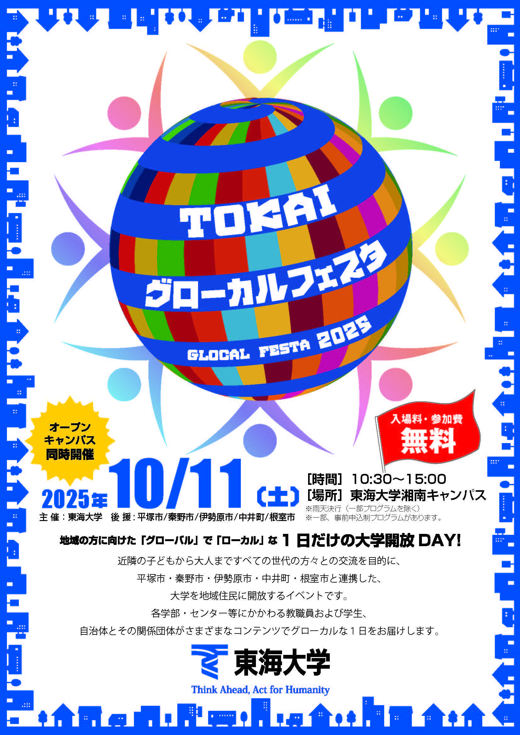 2025/10/01湘南キャンパスを地域住民に開放するイベント「TOKAIグローカルフェスタ2025」が、10月11日の午前10時30分から午後3時まで開催される。8回目となる今回は、70以上の企画が用意されている。