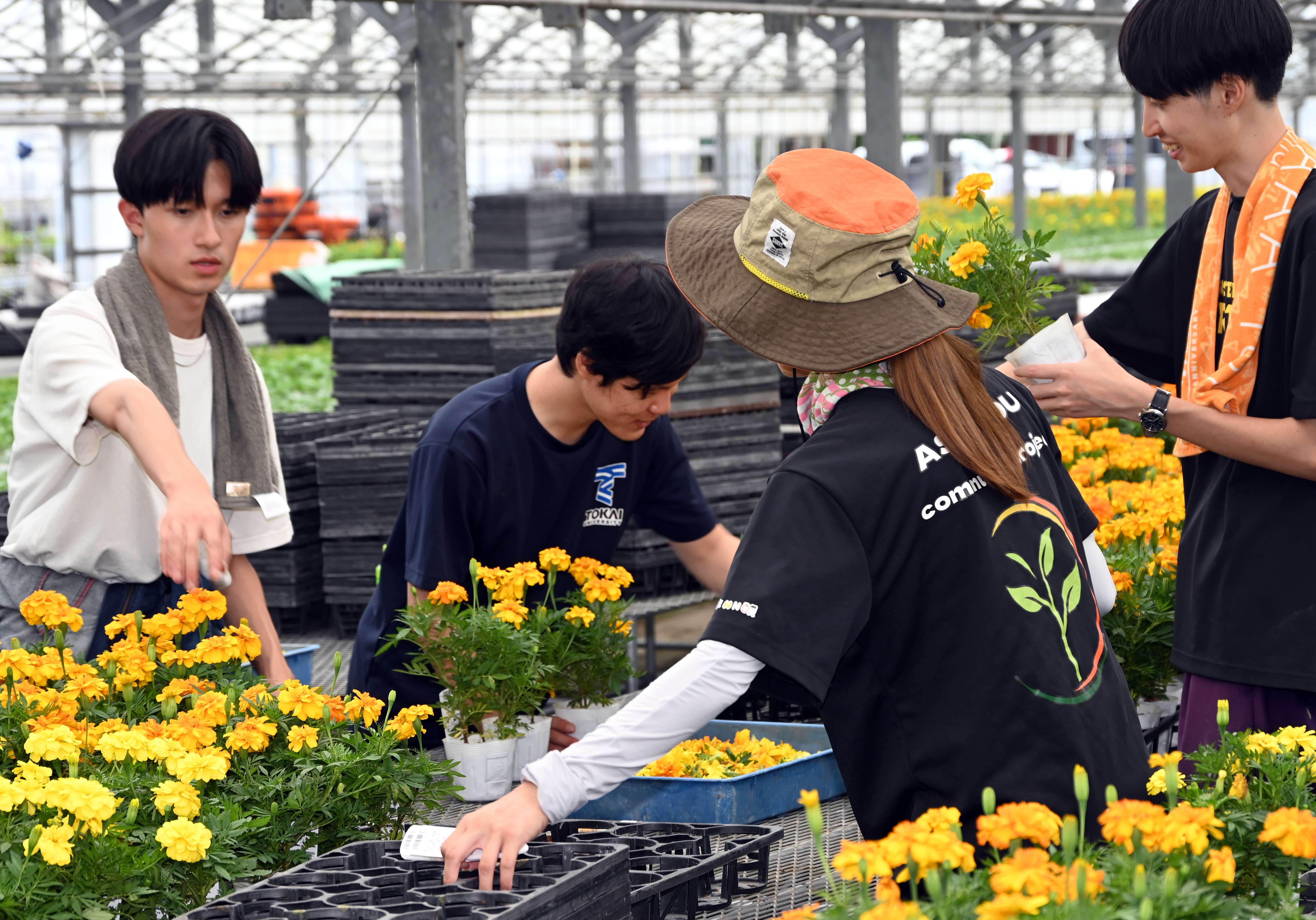 UBUYAMA PLACE 産山農場では、乳牛や肉牛の飼育環境を見学したほか、生まれたばかりの子牛に個体識別番号が記入された耳標と呼ばれるタグを取りつける作業にも挑戦=上写真。花卉農家での作業では、マリーゴールドの出荷に向けた準備作業に取り組んだ=左写真。