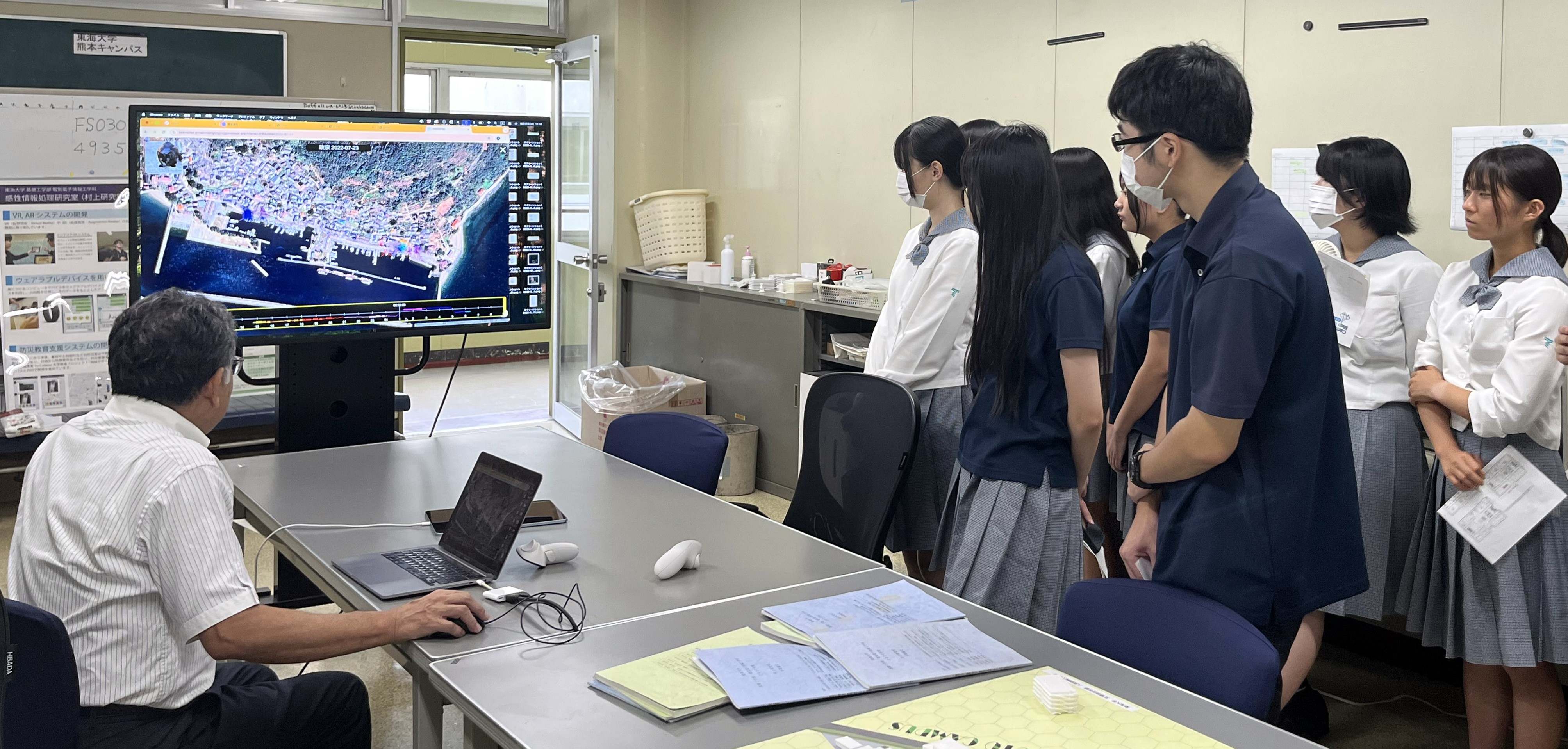 文理融合学部のある熊本では最初に研究室ツアーが行われ、生徒たちは5~10人程度の班に分かれて各研究室を訪問。教員が日ごろの研究活動や学生たちの学びの様子を紹介した。