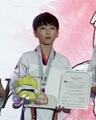 今年7月には、韓国で開かれた春川国際オープンに出場。架空の対戦相手と闘う想定で技を繰り出すプムセ部門のカデット(12歳~14歳の区分)男子で3位に入賞し、自身初となる国際大会のメダルを手にした。「プムセは攻撃や防御の動作など、決まった型を正確に演武する競技。当日は会場のマットが滑りやすいという情報を日本代表チームで共有し、“ゆっくり慎重に力強くやろう”と話し合ったことで、バランスを崩さず技を繰り出せました。初入賞はとてもうれしく、これまでの努力が報われた気持ちです」