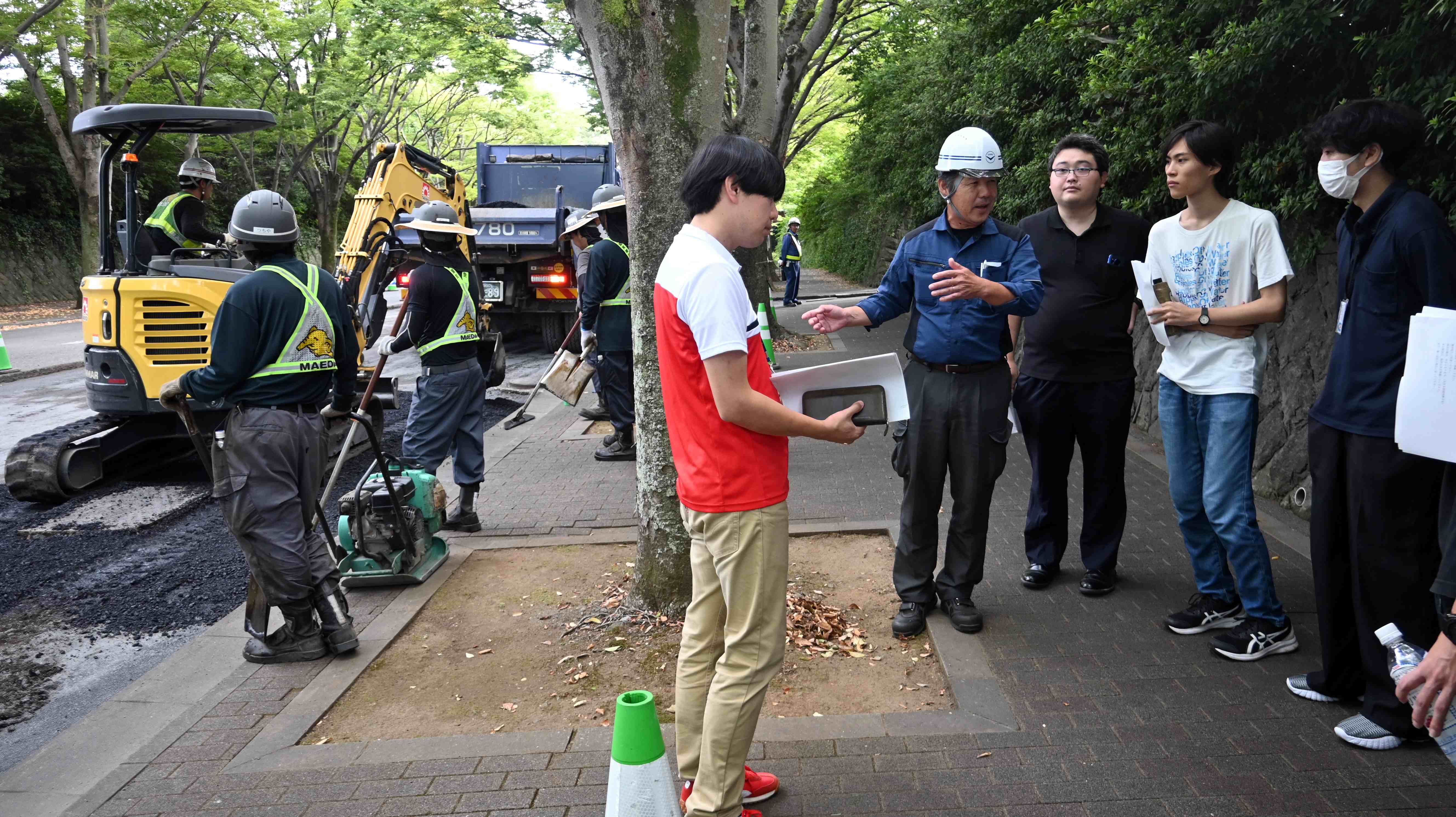 施工会社の担当者からは「道路の一部は学生の駐輪場になっており、バイクが傾いて倒れないように構成を変えています」といった工夫も紹介され、学生たちは興味津々で聞き入っていた。