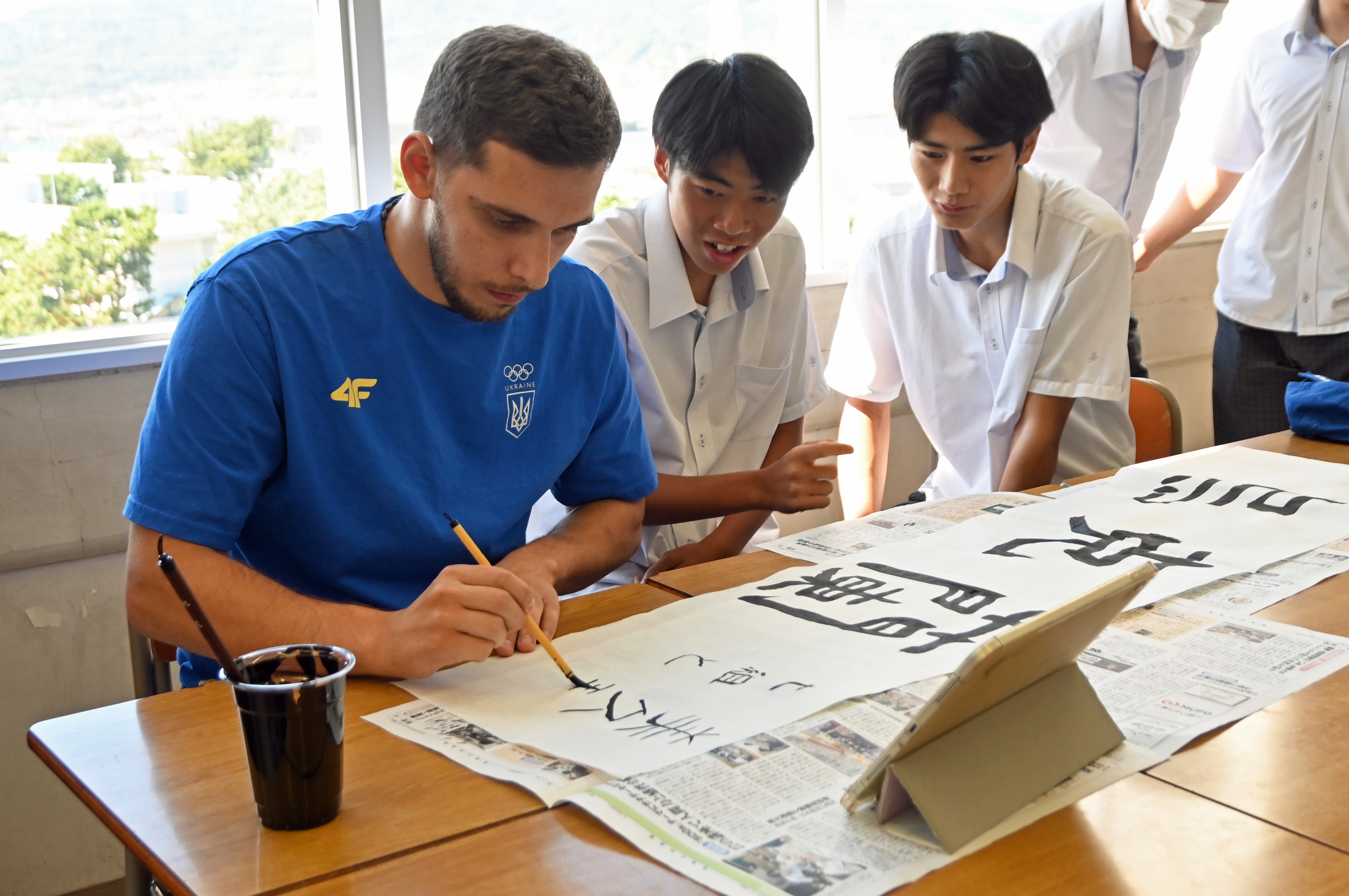 その後、2年生の教室で行われたクラス交流会では、選手団が1、2人ずつ各クラスに入り、「リレー書道」に挑戦。ウクライナの漢字表記「烏克蘭」を一人1画ずつ書いた。さらに、生徒が事前に考えた選手とスタッフの名前の漢字表記も紹介。選手団は生徒に漢字の意味を教わりながら、「烏克蘭」の横に自分の名前を慎重に記していった