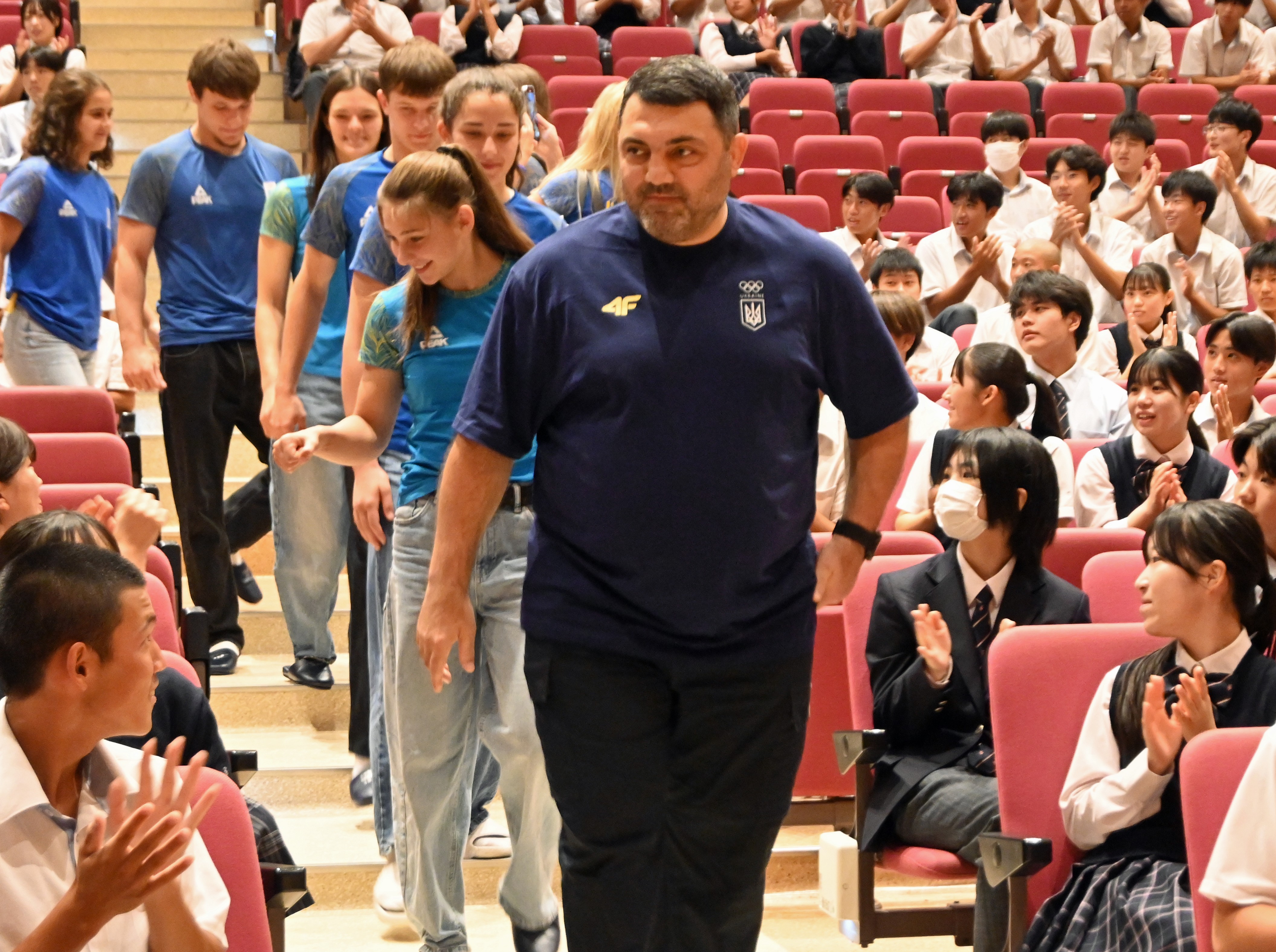 選手とスタッフ20人が来訪した今回は、10月7日に建学記念ホールで歓迎会を実施。2年生約400人が選手団を迎えた。初めに村上英治校長があいさつし、「生徒たちは皆さんとの交流を楽しみにしています。ぜひ友情を深めてください」と語り、静岡翔洋高のオリジナルTシャツを選手団に手渡した。続いてウクライナ国内や選手の練習環境について、選手団がまとめた紹介映像も上映された。