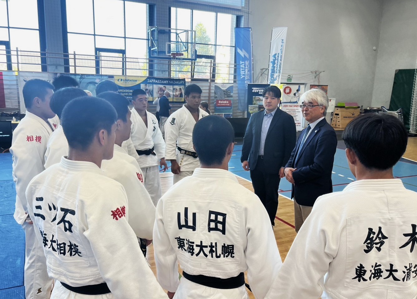 17日に日本を出発した研修団は、クラクフでヴァヴェル城などを見学。19日からはザコパネで、ポーランド柔道連盟と東海大学が主催する国際柔道キャンプ「BOSEI TRAINING CAMP -reach for the stars-」に参加した。ヨーロッパ各国から集った選手らと稽古に励み、穴井教諭と奥村教諭、三ツ石恵翔選手(付属相模高校3年)による技術指導も行われた。選手団のキャプテンを務めた髙倉慎吾選手(熊本星翔高3年)は、「他国の選手にアドバイスを求められる機会も多く、日本柔道への関心の高さを再認識しました」と話した。