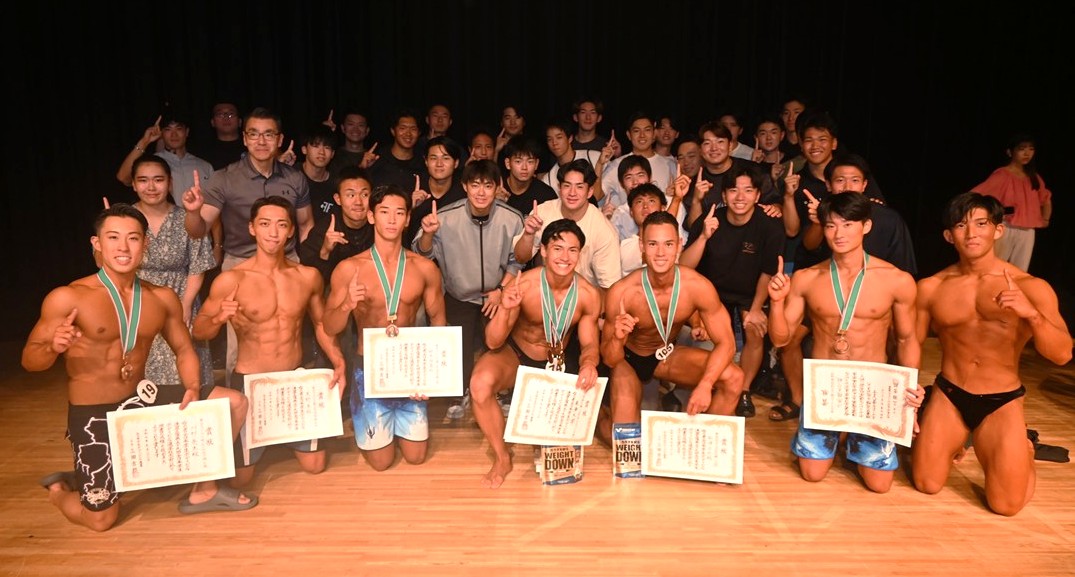 同大会は、全身の筋肉の大きさやキレ、バランスを審査するボディビル部門と、上半身の筋肉の形状やプロポーションを中心に審査するフィジーク部門に分かれている。ボディビル部は、フィジーク部門170センチ以下級で山田雄里杏主将(健康学部4年)が優勝。3位には川村亮太選手(工学部4年)が入った。176センチ以下級、176センチ超級でも複数の選手が入賞し、安定した成績を残した。