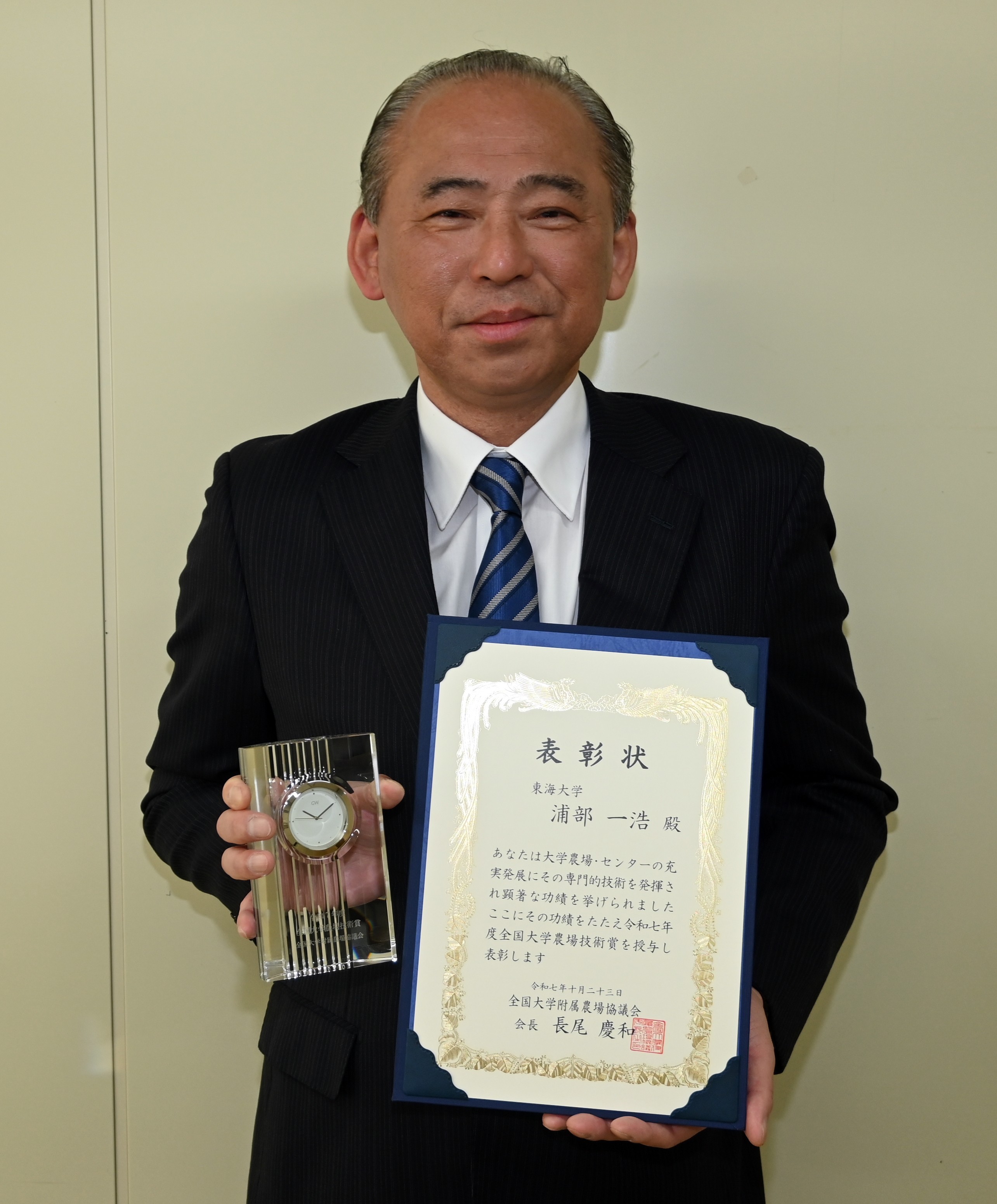 2025/12/01農学部農学教育実習センター上級技術員の浦部一浩さんが10月23日に、北海道大学で開かれた「令和7年度全国大学附属農場協議会」で技術系分野文部科学大臣賞を受賞した。技術系職員に贈られる「技術賞」受賞者の中で、特筆すべき業績が認められた人に授与される文科大臣賞は今回から新設。浦部さんは「食品加工技術の開発・指導による農場教育および地域社会への貢献」が評価された。