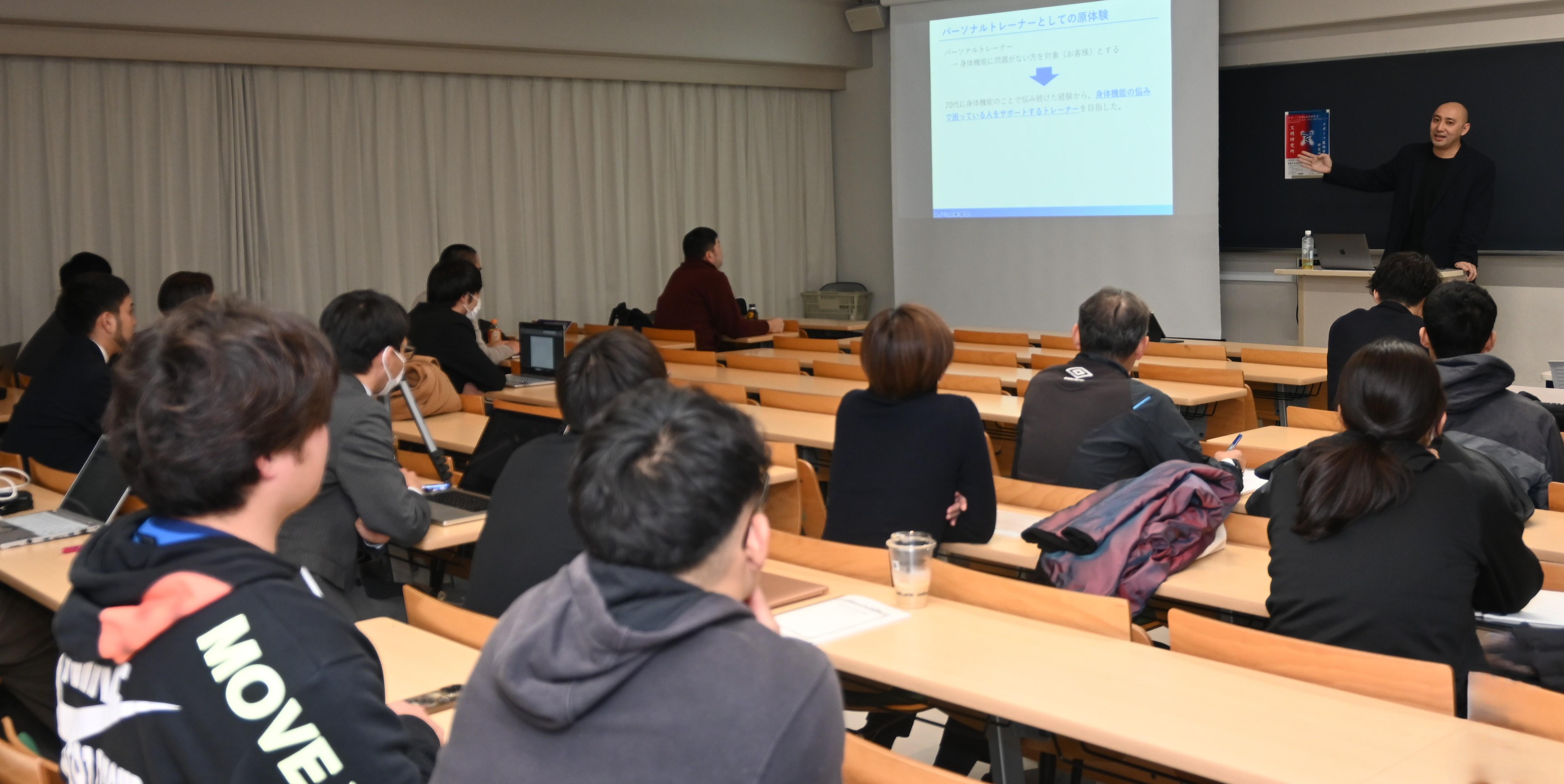 また、ベンチャー企業の経営者でもある岸陽さん(同)はIoT体幹トレーニングマシン「HiTREX」の開発について発表。体育学部生涯スポーツ学科の田巻以津香准教授は知的障がい者とのダンス活動を、同学科の谷木龍男准教授は性的マイノリティとスポーツに関する研究を紹介した。曾根田憲吾さん(工学部機械工学科4年)は「クライオセラピー」の効果測定について解説した。
