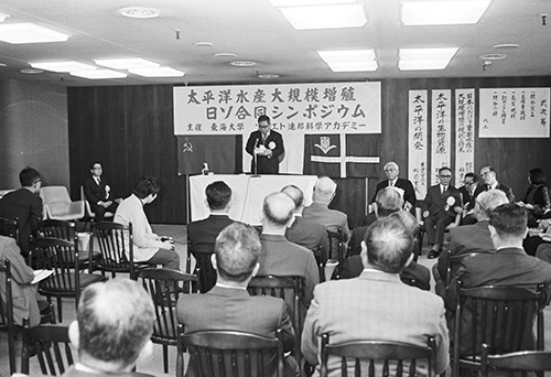 日本とソビエト連邦(当時)に正式な国交がなかった当時、サケ・マスの漁獲量は毎年両国が協定を締結する必要があり国際問題となっていた。そうした状況を、両国の科学者の学術的な交流を通して解決しようと、東海大学とソ連科学アカデミーが合同シンポジウムを開いた。会場となった東京・霞が関の東海大学校友会館には、日ソ両国の学者ら約150名が参加。松前重義総長(当時)が、「太平洋の開発」と題して記念講演し、「学問的かつ冷静な立場から、永久の人類資源を確保するという積極的な平和事業の一環として実りのあるものにしたい」と語った。5日まで開かれたシンポジウムでは、両国の研究者が互いの研究成果を発表。太平洋を「牧場」とする大規模増養殖技術を確立しようと活発に意見を交わした。このシンポジウムはその後1979年まで8回にわたって開催。両国の水産資源増殖技術の発展に大きく寄与した。